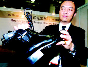 除了個(gè)性鞋墊外,帶充電器的皮鞋也吸引了不少好奇的目光。來自南通的一家廠家將充電設(shè)備與皮鞋連接,“每次充電以后,皮鞋可以在6個(gè)小時(shí)內(nèi)保持25至38℃”。