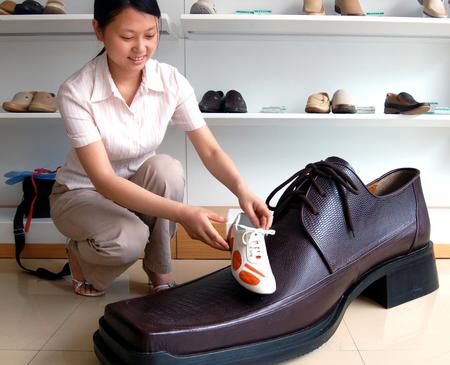 營業(yè)員將一只普通鞋與超級大皮鞋進(jìn)行比較。
