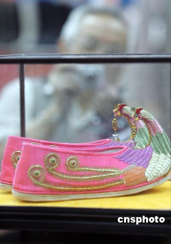 十月九日,一位觀眾正對著一雙展出的“回首金鳳履”繡花鞋拍照。當日,第三屆中國國際鞋業博覽會在北京舉行,中國、意大利、西班牙、葡萄牙等著名鞋品牌參展。作為全球最大的鞋業生產國和出口國,二零零五年中國鞋品生產總量已達九十億雙。