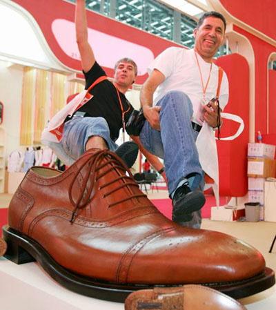 2006年秋季廣交會上,外國客人與溫州展覽鞋“比大”,鞋重大約40公斤。本月歐盟投票通過了對中國產皮鞋的正式反傾銷方案,在我國制鞋業引發巨大不滿,國內制鞋及出口企業利潤下滑。