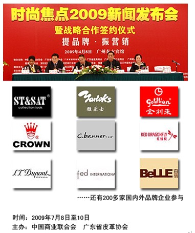 來自時尚焦點2009組委會的最新消息表明,國內外皮具鞋業領先品牌百麗、金利來、傲士、法國都澎、姬龍雪、斯通富來、諾貝達、圣瑕步、佛山星期六、梵馳、巨臣樂、鯊魚、紅蜻蜓、皇冠、雅士、新秀麗、雅樂士、愛步、樂途仕、迪寶、梅爾代格、百麗、威爾薩斯、萊爾斯丹、奧卡索、CD鞋、CNE、KISS CAT等近200家國內外主流鞋包品牌將參加2009第三屆中國(廣州)國際皮具鞋業展覽會,燕莎、賽特、新光天地、百聯、杭大、美美、大商、銀泰、百盛、金鷹、友誼、茂業、太平洋、新世界、王府井、巴黎春天等全國280家名百貨龍頭將派代表參與時尚焦點2009“對話廣州”論壇。
