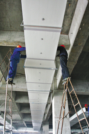 展館內部正被隔成多個展位。圖為施工人員在安裝冷氣管道。