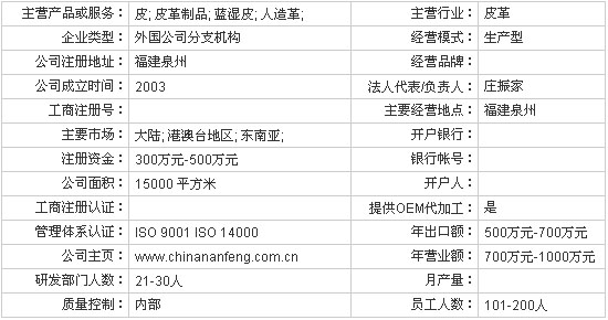 公司系外資企業(yè),法定代表人莊振家。是以建筑裝潢、 家具生產(chǎn)為經(jīng)營主導,同時涉及玻璃工藝品生產(chǎn)、皮革制作 及機械制造、房地產(chǎn)開發(fā)、物業(yè)管理、建筑幕墻施工、園林古建筑施工等領(lǐng)域。所生產(chǎn)各類 產(chǎn)品80%外銷,其“傳承、開拓”的市場理念使企業(yè)在激烈的市場競爭中長久立于不敗之地。