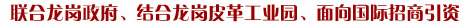 與龍崗區鎮政府聯誼,結合龍崗皮革工業園招商引資,聯合深圳市政府、龍崗區政府、龍崗鎮政府、深圳市外貿局、深圳皮革行業協會、深圳和龍崗皮革品牌企業,在各類國際皮革展覽會上實施聯合招商,推動龍崗皮革工業園的興建步伐,并促進國際皮革巨頭與深圳、龍崗皮革生產企業達成來料來樣加工合作機會。