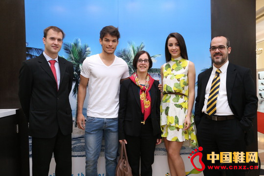 巴西駐滬總領(lǐng)事安娜女士(中)與國(guó)際名模、前巴西小姐Ariane Colombo(右2)、巴西鞋業(yè)協(xié)會(huì)國(guó)際項(xiàng)目總監(jiān)Cristiano Korbes先生在展臺(tái)合影